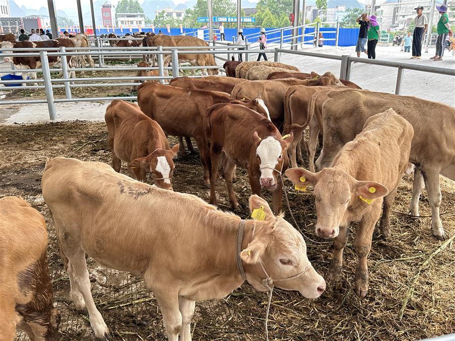 活動(dòng)現(xiàn)場(chǎng),熱鬧非凡,大家參觀了農(nóng)特項(xiàng)目園區(qū)及桂中牛行,并對(duì)園區(qū)今后的發(fā)展提出了意見和建議。桂中牛行作為農(nóng)特項(xiàng)目園區(qū)內(nèi)的首個(gè)主力商家,主營(yíng)活牛羊交易,副營(yíng)馬、驢、騾子等草食動(dòng)物交易。試業(yè)當(dāng)天,牛群“哞哞”聲此起彼伏,一頭頭體格健壯的牛兒一字排開,人們?nèi)宄扇旱貒墼谝黄?,仔?xì)挑選著心儀的牛兒。一旁的牛崽交易市場(chǎng)內(nèi),買家更是爭(zhēng)相搶購(gòu)體態(tài)良好的牛崽,市場(chǎng)交易紅火。