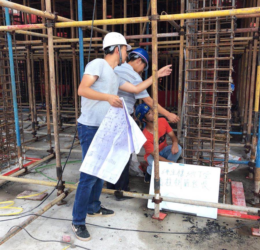 6月18日,在桂華分公司承建的梧州佛子時代廣場項目現(xiàn)場,當(dāng)空烈日讓偌大的工地一片熾熱,焊花飛濺,工程車來來往往,工人們揮汗如雨。雖然施工作業(yè)已經(jīng)避開了高溫時段,但工人們?nèi)员缓顾粤搜劬?,濕了衣服。盡管這樣,大家仍堅持“全副武裝”,手套、防護用具,安全帽,一樣都沒有少,自覺遵守安全文明施工相關(guān)規(guī)范。入行兩年的施工員趙俊財抹了一把汗說道:“剛參加工作時,不能和家人一起過節(jié)還挺難受的,后來把心態(tài)調(diào)整好了,想著只要家人安好,其實比什么都重要,趁著年輕,還是應(yīng)該多奮斗?!笨粗幻装舜髠€的他手拿圖紙和卷尺,蜷縮著身子,蹲在空間有限且熱得發(fā)燙的平臺上仔細檢查剛剛綁扎好的鋼筋籠,驕陽烤得他黝黑的皮膚泛出一層水光,襯著那還略顯年輕的臉龐,顯得熠熠生輝。
