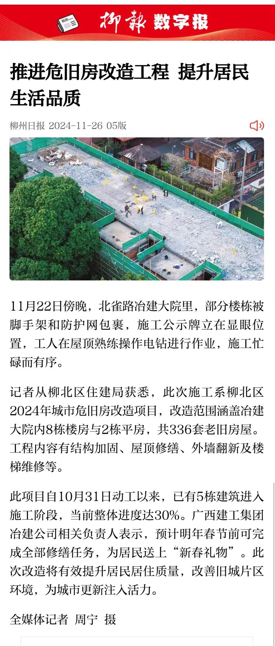 11月25日,《柳州日?qǐng)?bào)》五版以《推進(jìn)危舊房改造工程 提升居民生活品質(zhì)》為題,圖文并茂的形式報(bào)道了冶建大院危舊房改造項(xiàng)目順利推進(jìn)的情況。