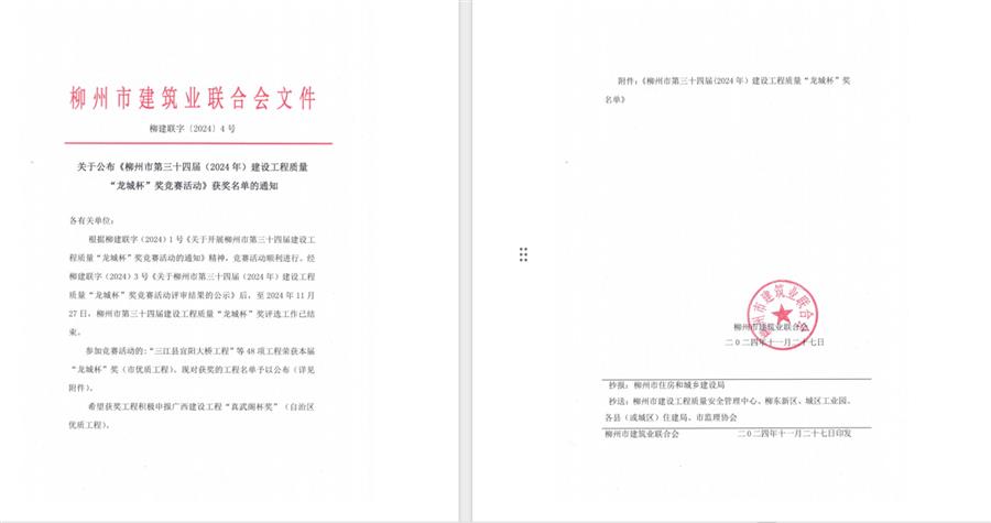 11月28日,柳州市建筑業(yè)聯(lián)合會公布柳州市第三十四屆(2024年)建設工程質量“龍城杯獎”競賽活動獲獎名單和2024年柳州市建設工程優(yōu)質結構獎名單,由冶建公司承建的三江縣宜陽大橋工程等4項工程榮獲“龍城杯”獎;柳州市柳東新區(qū)明德小學項目(一期)等2項工程獲柳州市“優(yōu)質結構獎”。