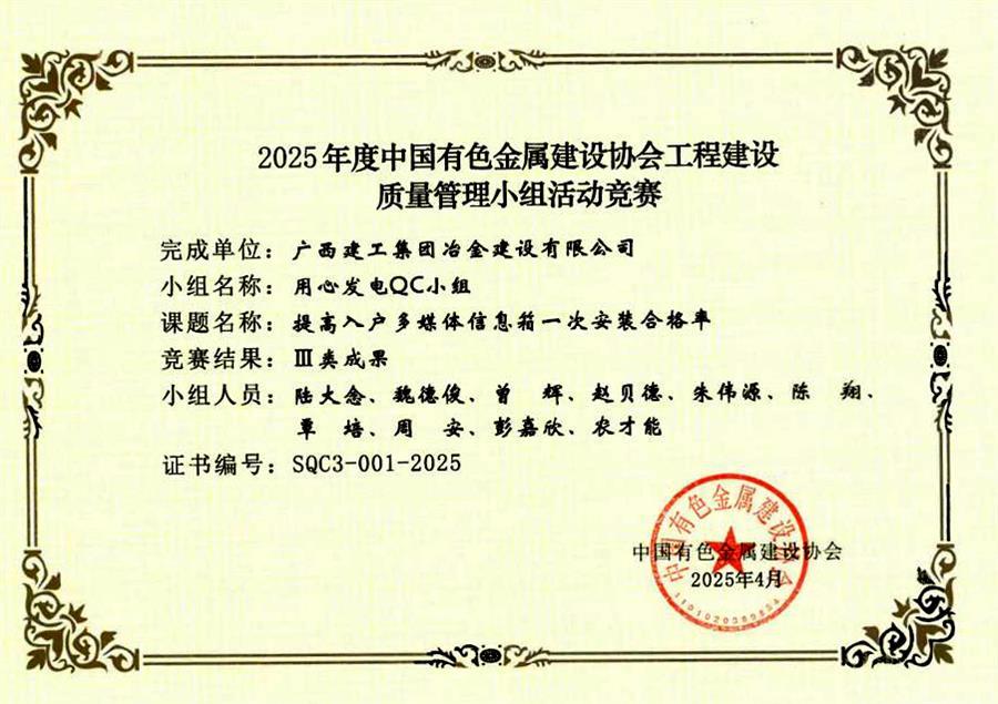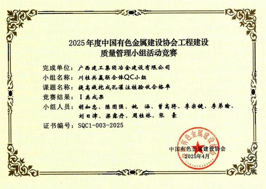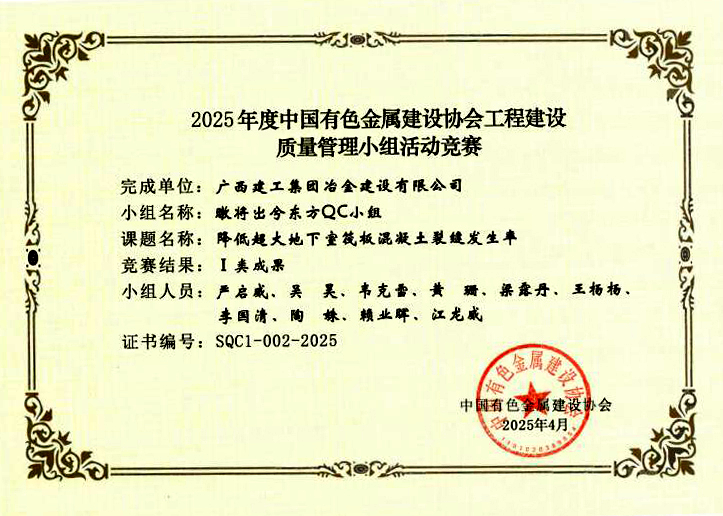 近日,中國有色金屬建設(shè)協(xié)會公布2025年度中國有色金屬協(xié)會工程建設(shè)質(zhì)量管理小組活動競賽結(jié)果,冶建公司申報(bào)的4項(xiàng)成果中,有三項(xiàng)獲得Ⅰ類成果,一項(xiàng)獲得Ⅲ類成果。公司此次申報(bào)獲獎率100%。