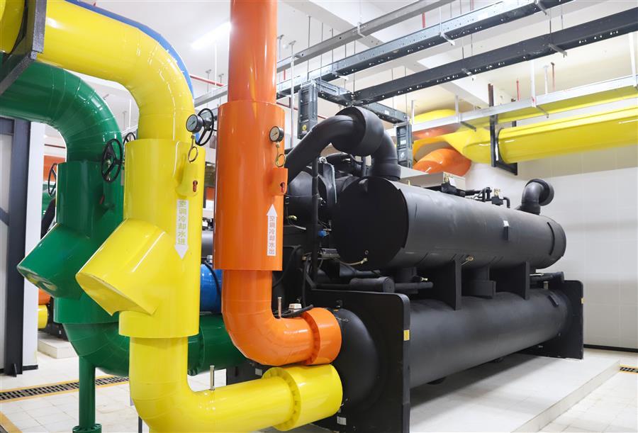 空調機房設備排布成排成行,空間合理,管線采用落地式共用管架。