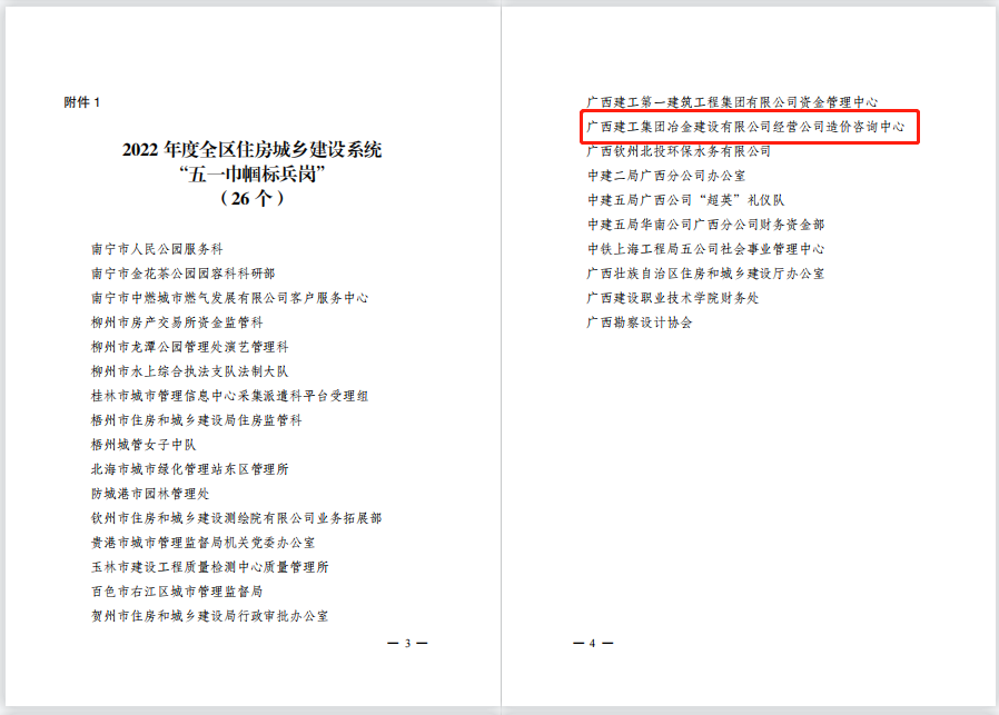 近日,廣西建設工會工作委員會下發(fā)了《關于命名2022年度全區(qū)住房城鄉(xiāng)建設系統(tǒng)“五一巾幗標兵崗”“五一巾幗標兵”的決定》,冶建經(jīng)營公司造價咨詢中心榮獲“五一巾幗標兵崗”稱號。